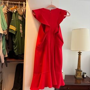 This vibrant red mini dress by Chelsea28 features a playful fit and flare silhouette with a ruffled hem. The sleeveless design is complemented by flutter sleeves and a chic halter neckline, making it perfect for a cocktail night out.