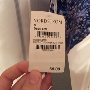 New with tags! Beautiful blue floral Top with purple detail. Lace detail on shoulder and button closure on back. V neck front. Size small. 100% polyester.