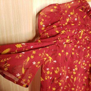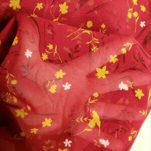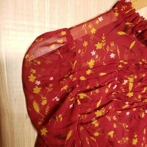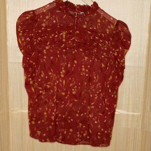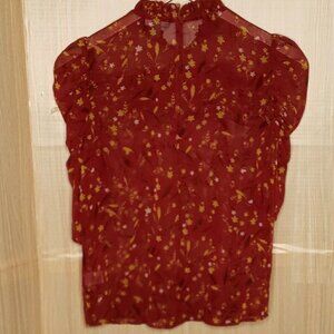 Chelsea28 women’s red floral sheer high neck blouse small. Gently used condition. Measurements are: 16” sleeve, 25” from shoulder to hem, and 18” from armpit to armpit.