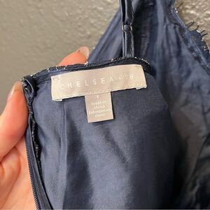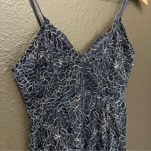 Metallic embroidery lends a flash of shimmering glamour to a romantic dress in a sheath silhouette with a scalloped neckline and semisheer extended hem. 32" center front length (size Medium) V-neck Adjustable straps Lined 72% nylon, 22% rayon, 6% metallic fibers