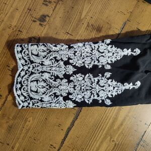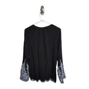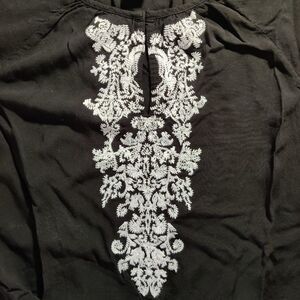 This is a black Chelsea & Theodore long sleeve shirt with a keyhole at the front chest and white embroidery at the sleeves, hem, and v-neck. This top measures 27 inches from shoulder to hem, 19.5 inches from armpit to armpit, and the sleeves measure 26 inches from shoulder to the end of the sleeve. This top is preloved with no flaws.
