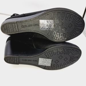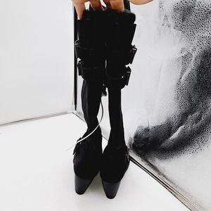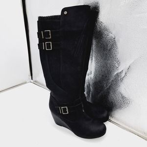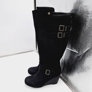 Chelsee Girl Day Dream Explorer Edition Black Knee High 3 1/4"Wedge Heel. Inside Faux fur for warmth and comfort. Sock top lining. 3 buckles for decorative touch.