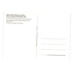 Vintage postcard featuring the Chemins de Fer Montreux – Glion / Rochers de Naye trains ABhe 2/4 201, 206, and 204 navigating snowy alpine scenery. Dated 1982.