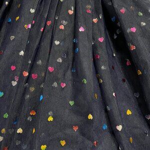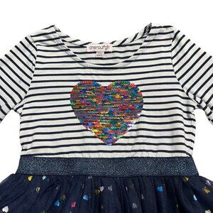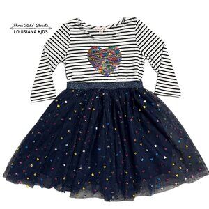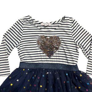 This precious dress will surely be a favorite! It features a navy and white striped top with a large flip sequin heart on the front. One side of the sequins has a variety of rainbow tones, and the opposite side is silver. There's an attached navy blue layered tulle skirt with colorful metallic hearts. Size XS (4/5)