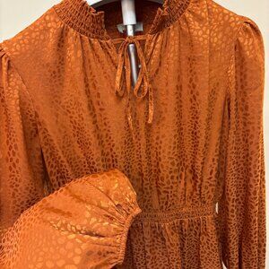 Great condition! Polyester Spandex loose fit with rouching neckline with tie and rouching stretchy waistline. Subtle cheetah animal print design brings an element of fun. Pair with brown riding boots and have a cute and comfy fall outfit!