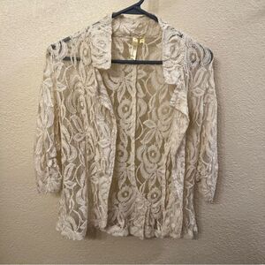 This sheer shell is from Chenault. This item is white with a lace pattern. The shell is made from 80% cotton and 20% nylon. The size is small. The measurements are 24” L x 22” W (pit to pit) x 16” sleeve (collar to cuff). The elegant shell has been gently worn but it is in great condition.