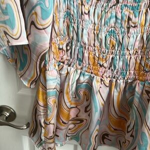 Keywords: Renoul, swirl print blouse, flutter sleeve top, smocked blouse, bohemian top, chic blouse, off shoulder top, womens blouse, size S, pink blouse, multi color blouse, boho top, festival top