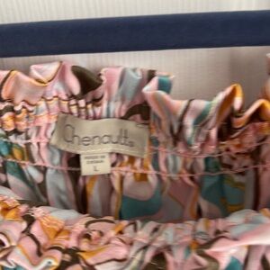 A charming Chenault blouse featuring a unique swirl print. This top showcases a smocked bodice that provides a flattering and comfortable fit, complemented by flutter sleeves that add a touch of bohemian flair. The fun top can be worn on or off-the-shoulder. The retro pattern gives a chic appeal, making it a standout piece for any wardrobe. Perfect for a night out or vacation. Great pre-owned condition, smoke and pet free home.