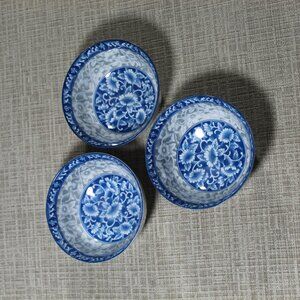 Set of 3 GORGEOUS! Cheng Blue, White and Gray Jade Floral Design Porcelain Rake Wave Peony Rice 3" Rice Bowl