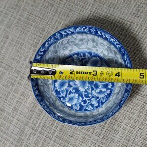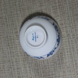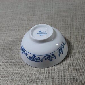 Outside has blue floral design. Inside has blue floral edge and blue floral bottom and light grey floral design. Simple yet stunning. These small bowls are perfect for a small dessert, Saki, condiments or just about any small portion.