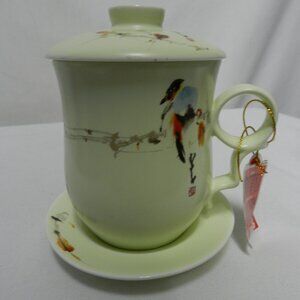 Chengyi Ceramics Cup Mug with Saucer & Lid green Birds Asian Chinese NEW NWT