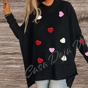 Chenille Slouchy Baggy Dolman Hearts Patchwork Cowl Neck Drapery Jersey Top