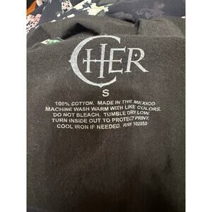 Standout one-of-a-kind upcycled Cher piece! This reworked graphic tee features a vintage-style Cher “Heart of Stone” print on the front. It has been transformed with dramatic kimono-style sleeves in black floral chiffon and finished with ivory crochet fringe for a true boho-rock vibe. A rare, handmade statement top for music lovers and fashion risk-takers alike.