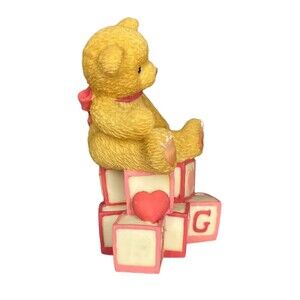 This adorable Cherished Teddies figurine, titled "Bear With Love Letters," is a must-have for any collector or lover of teddy bears. Created by artist Priscilla Hillman in 1996, this small multicolor bear is made of resin and features the sweet message "I Love Hugs" on a stack of love letters.