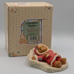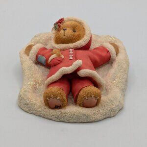 This 1998 Cherished Teddies figurine, "Angels Snow How to Fly," captures a sweet moment with Carol, a little girl making a snow angel. A delightful addition to any collection, the piece is in excellent condition and beautifully detailed. Box is showing some wear due to age.