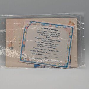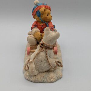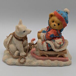 Erica and her husky dog are ready for winter fun in this delightful Cherished Teddies figurine from 1996. "Friends Are Always Pulling For You" features Erica on a sled with her loyal companion, capturing the spirit of friendship. The figurine is in excellent condition and includes the original certificate of adoption. While the box shows wear due to age, it's a wonderful find for any collector!