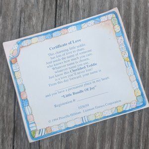 MIB Cherished Teddies "Little Bundle of Joy" #103659 manufactured in 1994 by Enesco also comes with original "Certificate of Love" paper. Measures 2.5"H x 2.75"W x 2.5" deep. This adorable figurine of a cupid baby girl on a pillow is perfect for Valentine's Day or could be used as a thoughtful baby gift. Collectible. From a smoke free home. Offers welcome.
