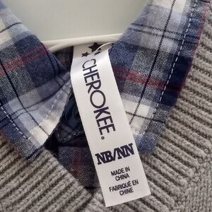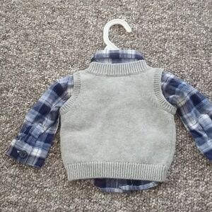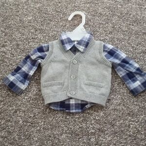 This set has 1 Long-sleeve button-down collared shirt in blue/white plaid plus 1 Grey buttoned Vest. Size newborn.