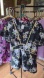 Chic floral scrub top with a V-neck design. Features vibrant yellow accents on a black background. Grey and black pants sz xs