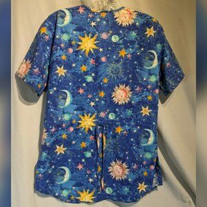 Cherokee Blue Celestial Scrub Top with Planets, Moons and Stars in Medium! EUC!