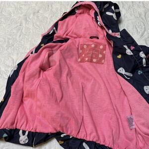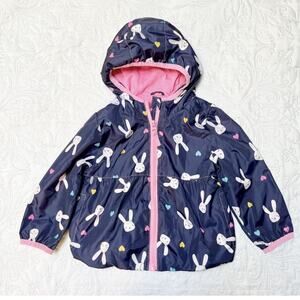 Cherokee full zip lightweight jacket with hood. Navy blue with bunny print. Good condition, some overall wear and spot on sleeve that looks like it will wash out. Size 18 months.