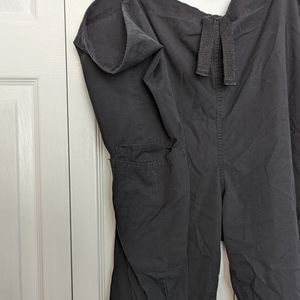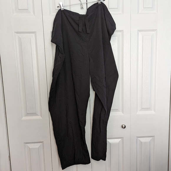 Black polyester and cotton blend scrub pants with thick drawstring waist. One pocket in the back and two pockets on the right leg. There's some wear in the crotch area. They're in good used condition.