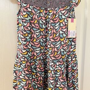 Cherokee Gray Bird Dress Lace Top Girls Size 3T. New With Tags. Adorable pink, blue, white and yellow bird print dress with a gray background. Flutter sleeves and lace top detail.