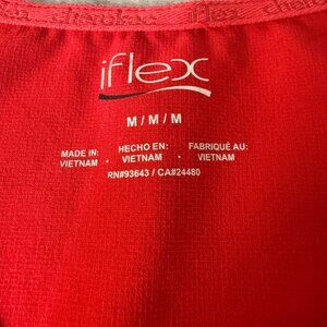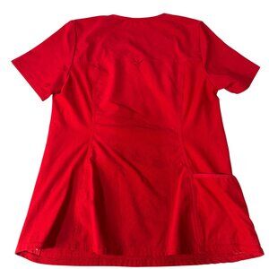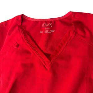 This Cherokee Iflex women's scrub top in medium size features a vibrant red color with a comfortable V-neck design. Made of a stretch polyester blend, it offers functional pockets and durability.