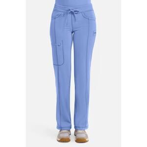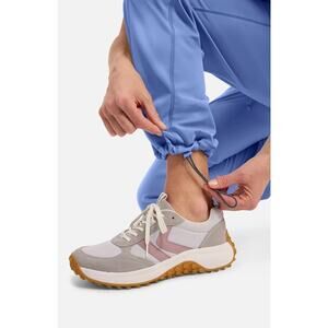 These scrub pants are by the brand Cherokee. They feature a ribbed band at the waist with drawstring to adjust, side pockets, a zipped side pocket, 1 back pocket and drawstring/toggles around the bottom of cuffs to adjust. Fabric is a lightweight breathable poly blend. No flaws to note, pants are in excellent condition!