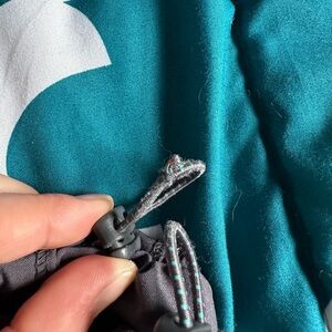 EUC, no rips, tears, but does have a rub on one of the hem bungee from dragging. Does not affect the bungee or fit. Low Rise, has rib knit waistband, adjustable waistband, bungee loop below left pocket, 1 back pocket, 1 zip cargo pocket at left, bungee interior pant hem. Comes from a smoke free pet friendly home.