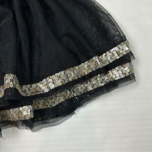 Size 4/5 Cherokee black tulle skirt with gold and silver sequins trim. GUC has a loose thread nothing damaged. So cute for parties, halloween, or dress up