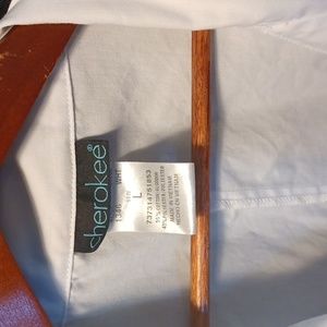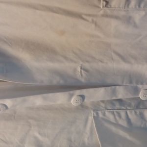 Lab coat is 39 inches long from shoulder to bottom. It has a couple of minor darker spots, as you can see in the pictures. They might come out with some light bleach or a stain remover. Coat has 3 pockets, and is in very good used condition with no rips, tears, or fraying.