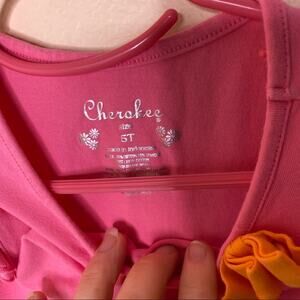 Cherokee Pink Orange Floral Print Dress 5T. Preowned and in great condition. Top part of dress is pink and solid while the bottom is a mix of pink and orange printed flowers. Very light weight and cute for spring.