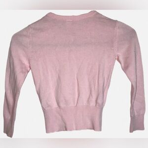 Charming pink cardigan with ruffle detail. Soft and stylish. Perfect for layering.