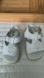 Shoes are solid white, have a decorative cut out design on top and have tan rubber soles