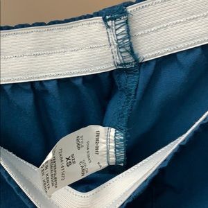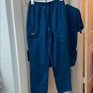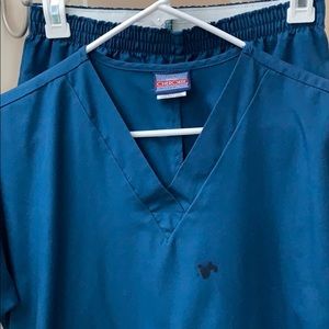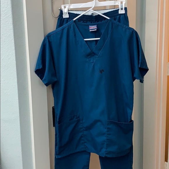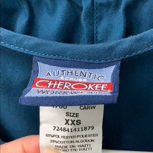 Cherokee Scrub Set in “Caribbean blue” color. Top is size XXS (I’m normally a Small). Pants are size XS (I’m normally a small) and have lots of stretch. Ink stain on scrub top from pen, but otherwise ; set has only been worn a couple times. Honestly a badge can cover this. Price reflects mark.