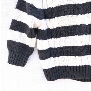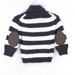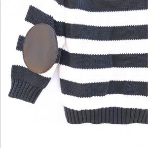 New never worn, grey and ivory striped cable knit sweater. Faux leather elbow patches. Mock neck with two button details.