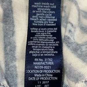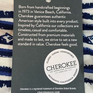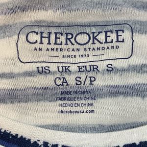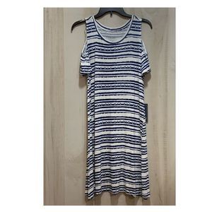 Cherokee Striped cold shoulder dress in navy and white. Easy care, machine wash and dry.