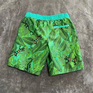 Cherokee brand kids swim trunks. Green fauna and salamander/ gecko/ lizard print. Tag says size M. I would say this could fit roughly a kids 12-14. Waist 13 1/4”, rise 10”, inseam 7 1/2”