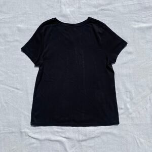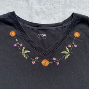 Black V-Neck Tee Floral Embroidered T-Shirt Loose Relaxed Medium Short Sleeve
