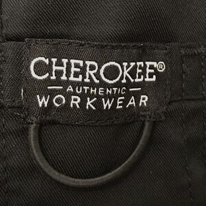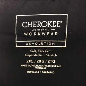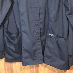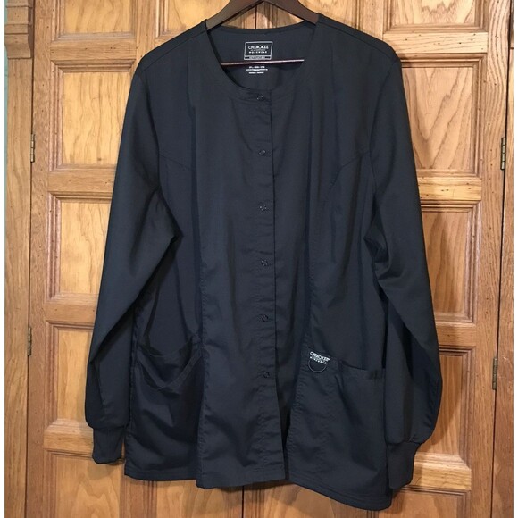 Cherokee Workwear Revolution Scrub Jacket. Women's size 2X, Black, Long Sleeved, Snap Front, Stretch, Ribbed Cuff Top. 3 Pockets, with Loops and Key Fob. Polyester - Rayon - Spandex.