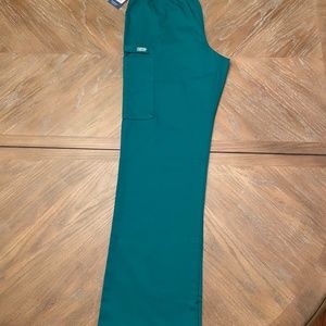 These Cherokee 4200 utility pants sit comfortably above the elastic waist to provide you with extra flexibility. For storage, you will find two cargo pockets, a cell phone pocket, and an outside scissor pocket. The tapered legs provide ease of mobility around the office. Fabric is 65/35 poly/cotton poplin with soil release except white, which is 55/45 cotton/poly.2