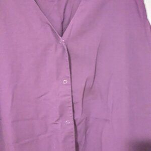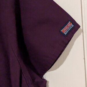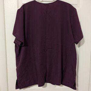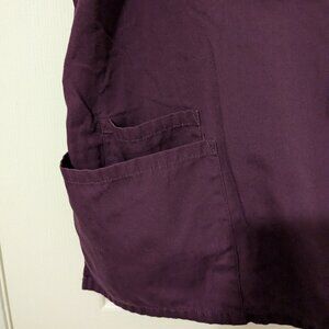 There is no size or material tag. These were my personal scrubs so I know the size. The matching pants are also in my closet and the content on them is 65% polyester and 35% cotton. I have 2 available and both are in excellent condition. Official color is eggplant. 2 large and one small patch pockets. Discount for buying multiple items.