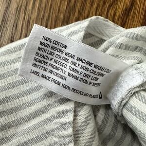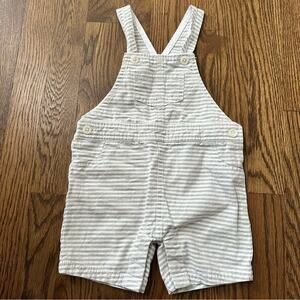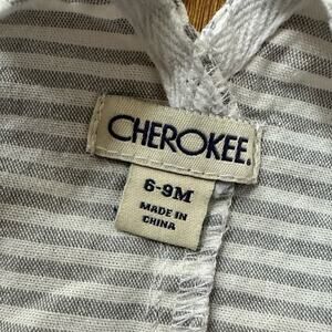 Cherokee grey and white striped seersucker overalls. White buttons. Pocket on the chest. Snaps around the legs for easy changing. 100% cotton. Size 6-9 months.