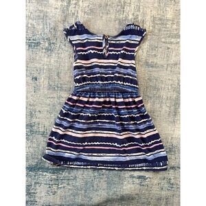 Blue dress with blue and pink stripes. Pink Pom trim on the shoulders. Buttons at back of neck. Elasticated waistline.
