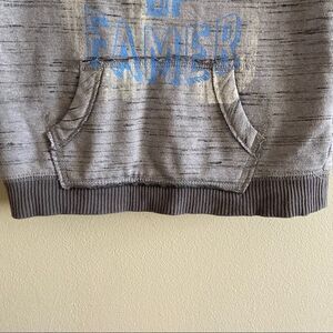 Gray sweatshirt long sleeve. ‘Future hall of famer’ writing on the front with light blue color. Kangaroo pocket on the front. Elastic on the hemline and cuffs. Crew neck. 80% Cotton, extra lining inside to keep warm