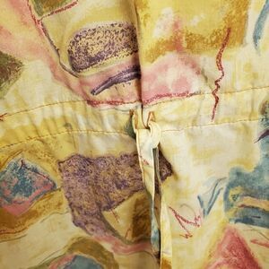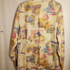 Pink, blue and green block design. Snap up, two pockets in front. Cinch waist. Long sleeve with tan ribbed cuff. Does not have a size. Measured the same as a medium I posted.