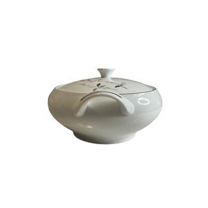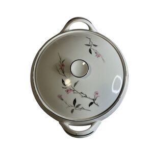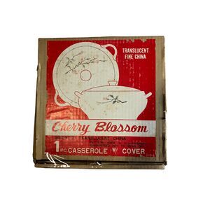Elegant vintage Cherry Blossom fine china covered casserole from Japan. Delicate pink and gray floral design with metallic trim, translucent porcelain, and matching lid. Includes rare original vintage box.