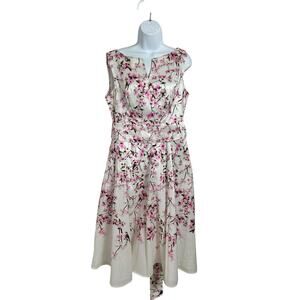 Cherry Blossom Print Dupioni Midi Dress Sz 16 Split Boat Neck Sash Belt New