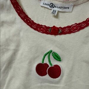Charming cream tank top featuring cherry embroidery. Accented with red trim for a stylish touch.